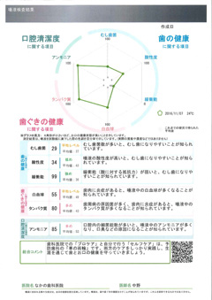 この検査は採取した唾液から、歯の健康(酸性度・緩衝能・むし歯菌数)、歯ぐきの健康(たんぱく質・白血球)、口腔清潔度(アンモニア)などの全6項目を測定し、現在のお口のリスクを判定することが可能です。