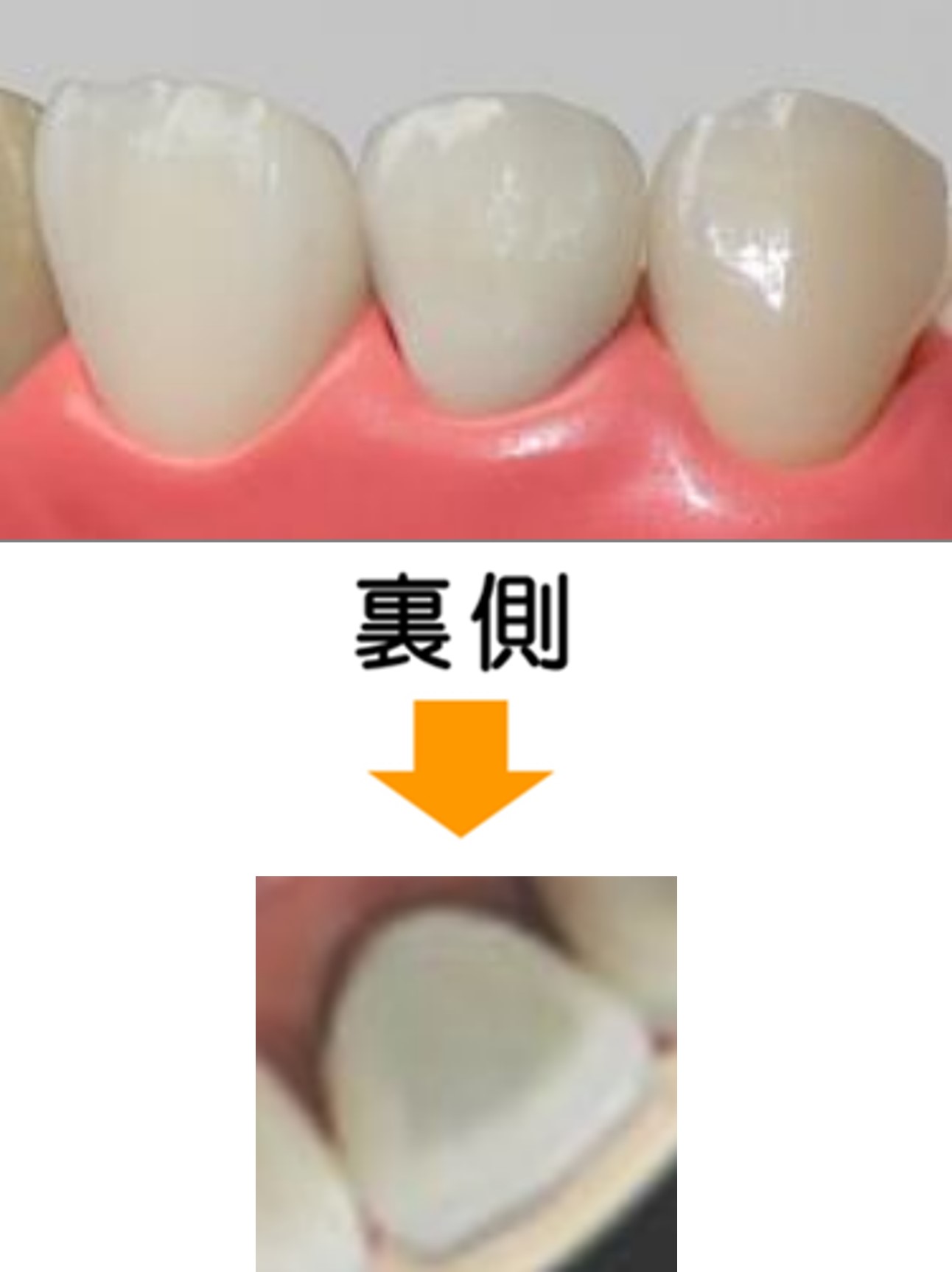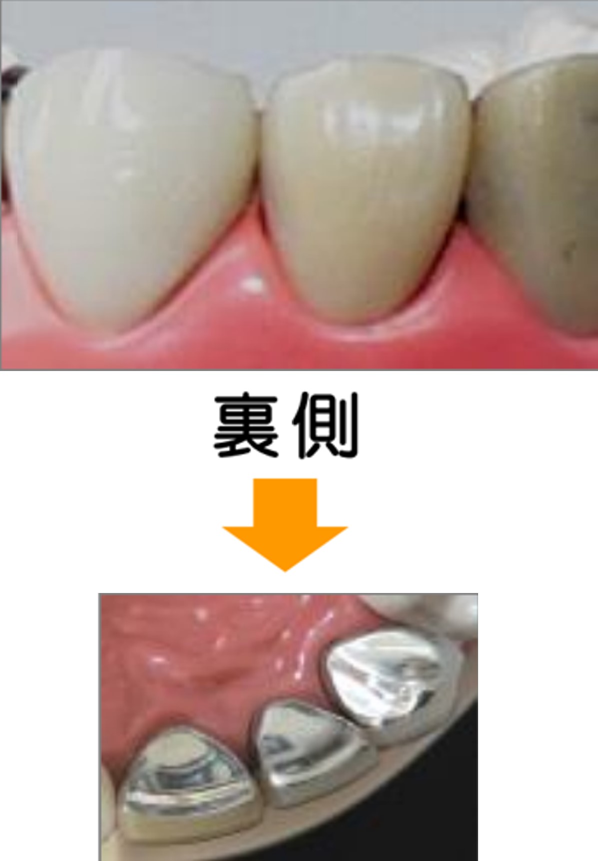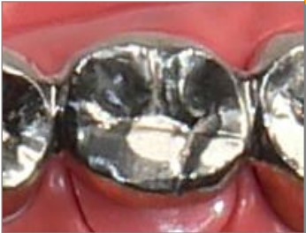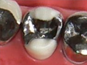 頬側のみ白く、かみ合わせの面は金属になります。